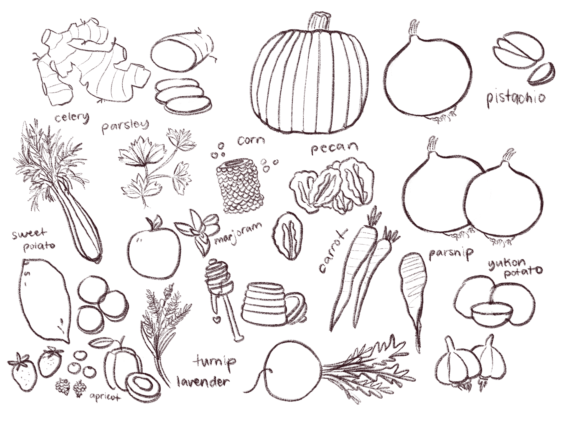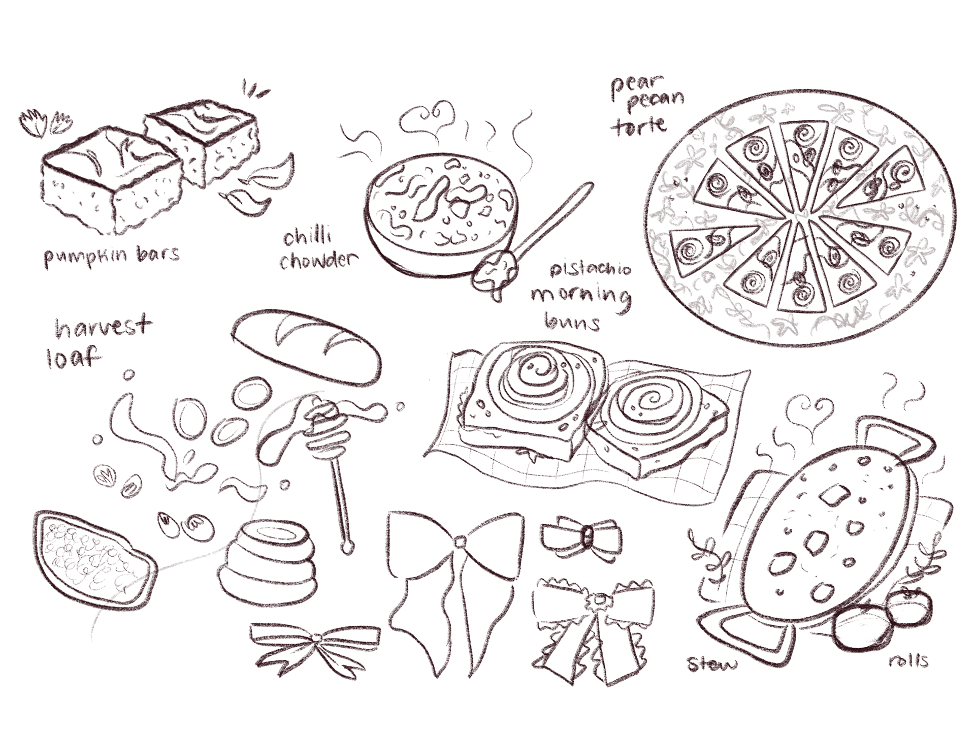 As Hayley determined the best fonts for the woodsy aesthetic and the layout of the type, I worked on finding the best illustration style to match. I experimented with different brushes in Procreate that had soft and chalky textures that remind me of a forest environment with an adorable cafe run by critters. I ultimately decided on a chalky color fill, with a light pencil line work.