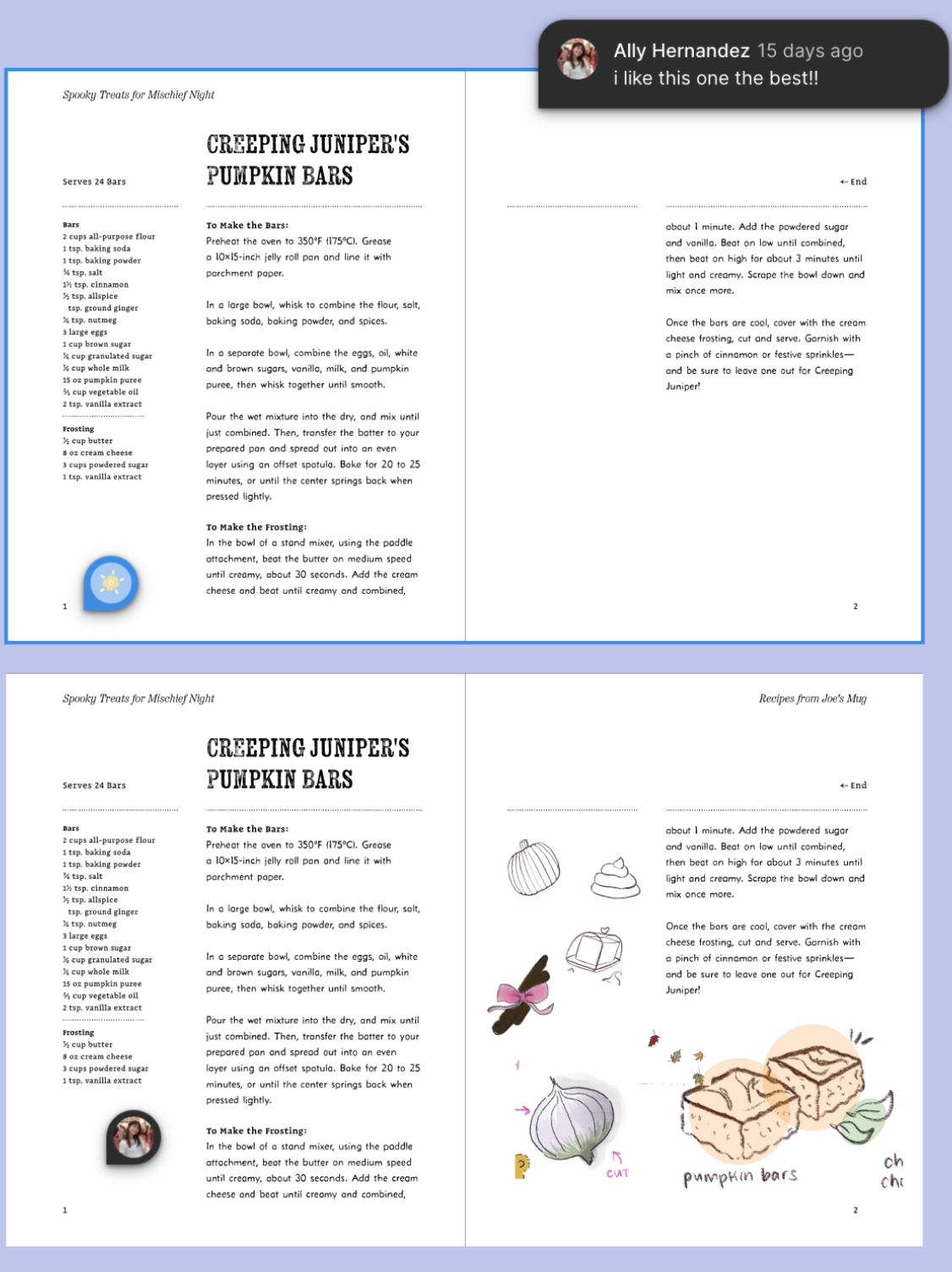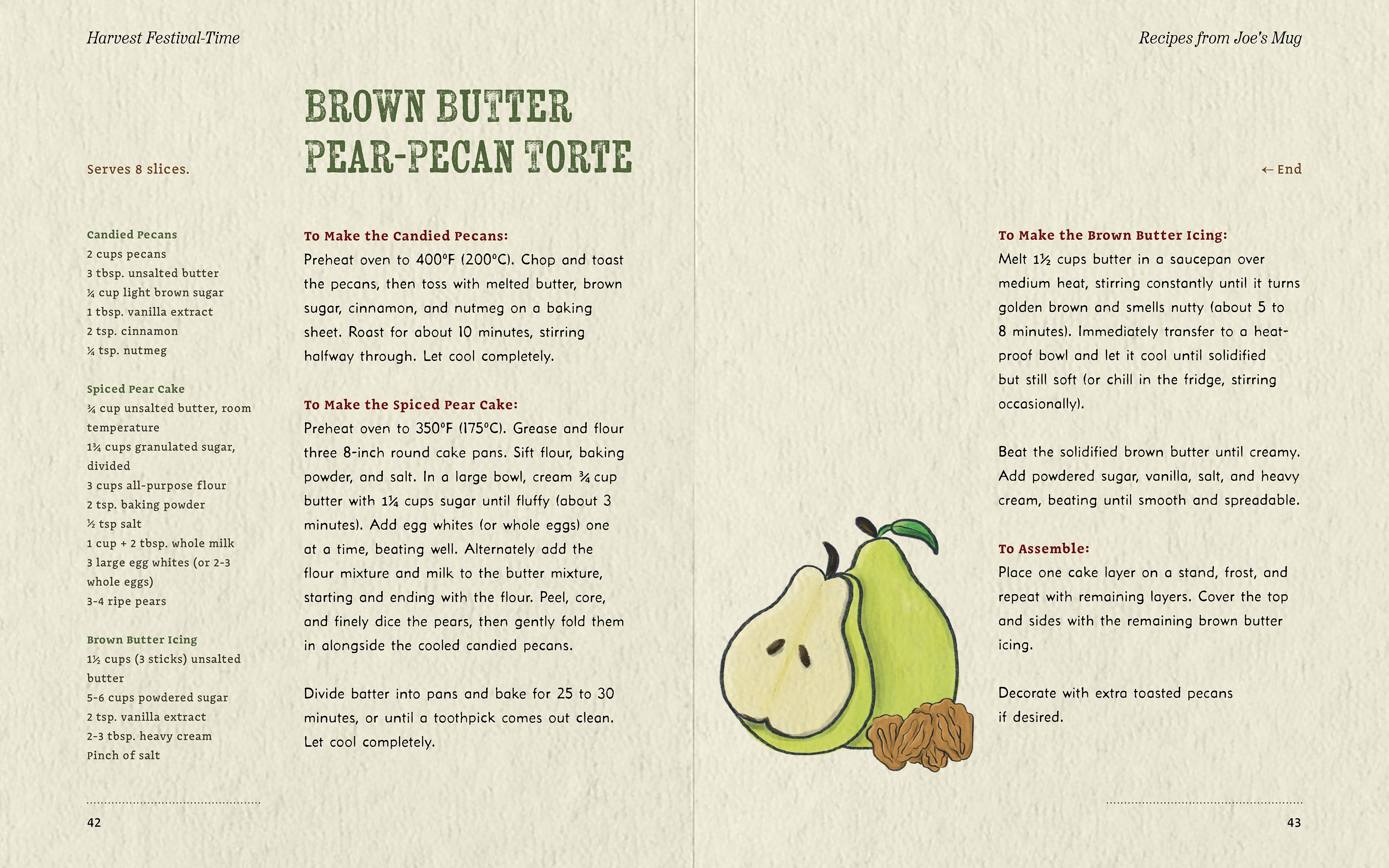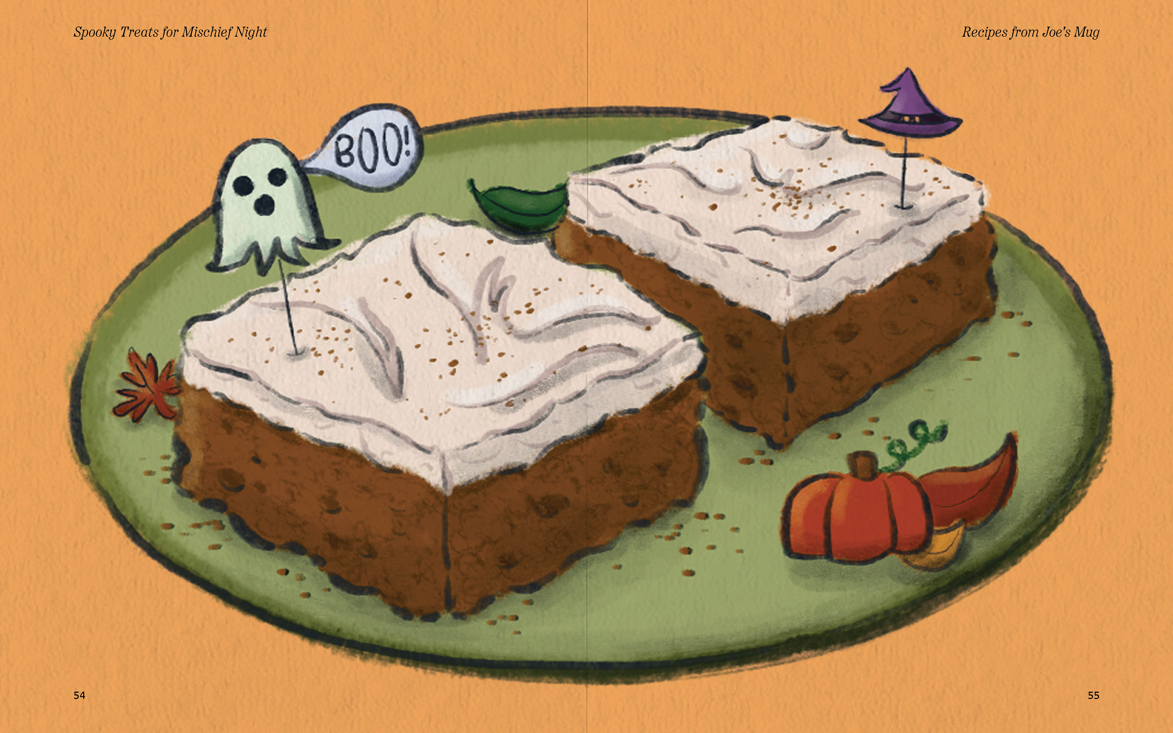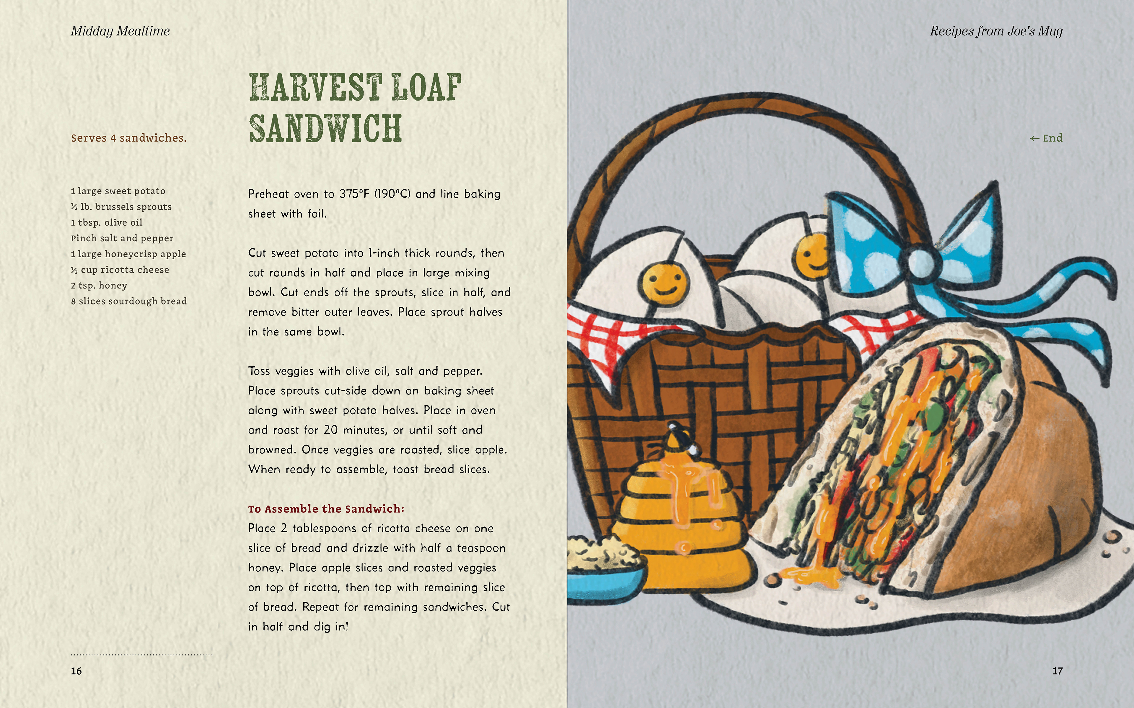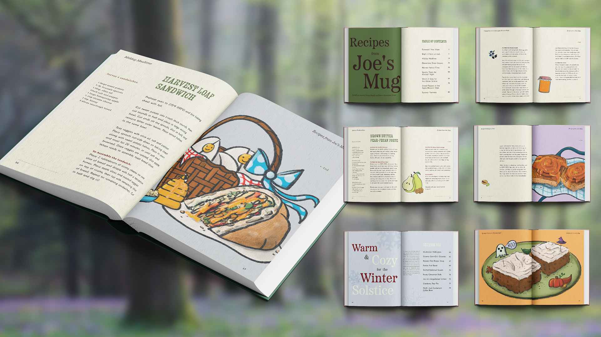 The Shady Hollow series tells of murder mysteries in a woodland community, solved by the fox detective Vera Vixen. With such a cozy and inviting aesthetic, my friend and fellow designer Hayley Blonstein and I decided to collaborate on a cookbook based on the charming in-story diner Joe’s Mug and its dishes.