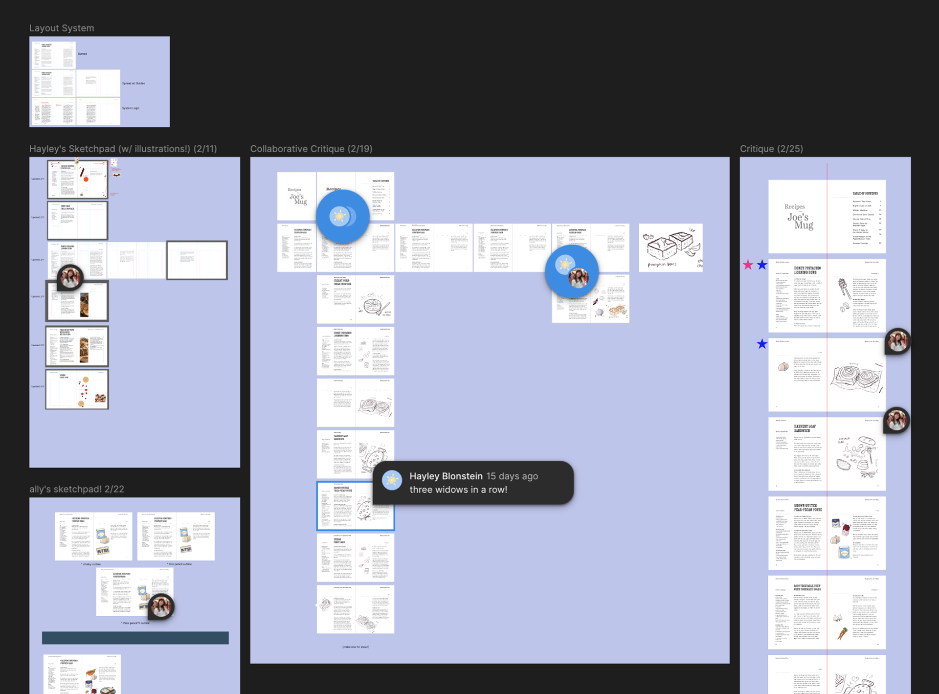 While the tasks of illustration (done by me) and typography (done by Hayley) were mostly split in half, we met weekly over the course of one month for critique sessions. During these sessions, we would provide feedback on each other’s work and bring the pieces together in a shared Figma file. This was a truly unique and enjoyable experience, as we hadn’t collaborated on projects while in university together!